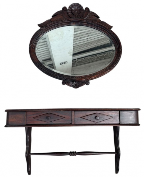 • Aparador com espelho, em madeira nobre , apresentando duas gavetas frontais e pés torneados, acompanhado de espelho oval com moldura entalhada em relevo. Medidas: aparador 80 x 43 x 23,5 cm; espelho 67 x 64 x 5 cm.
