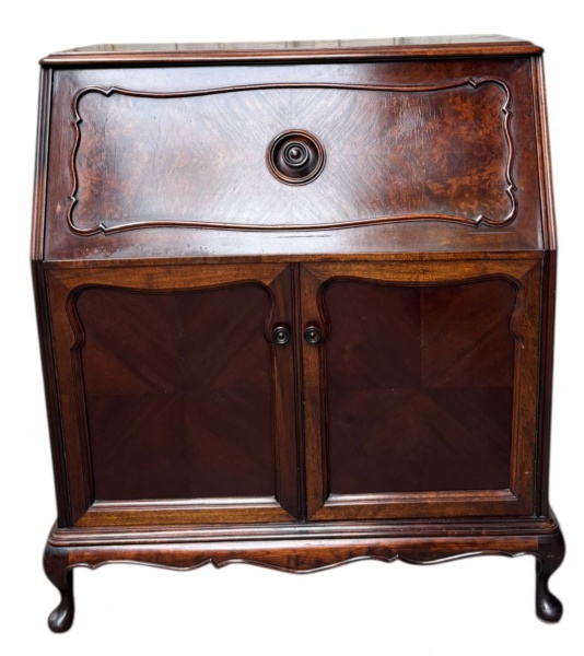 • Antigo móvel escrivaninha em madeira nobre, com tampo superior basculante, gaveta frontal e duas portas inferiores, revelando interior compartimentado com divisórias para pastas e acessórios. Apresenta acabamento em lâmina de madeira com desenho em padrão radial e pés levemente curvos. Medidas: 88 x 102 x 49 cm.