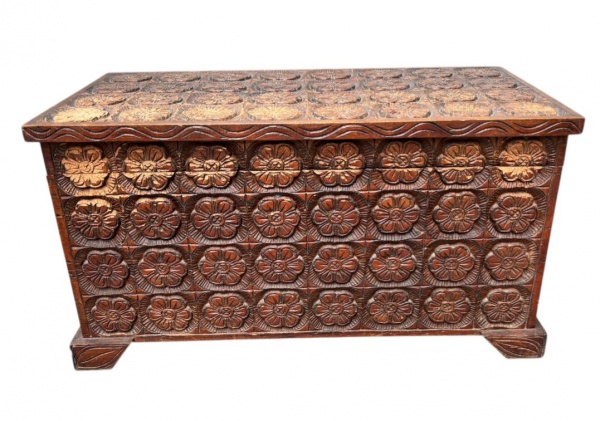 • Antigo baú em madeira, ricamente entalhado com motivos florais em relevo por toda a superfície, tampa articulada e interior amplo com compartimento lateral. Apresenta base elevada e acabamento rústico. Medidas: 100 x 53 x 51 cm.