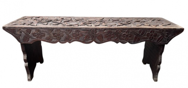 • Banco em madeira, ricamente entalhado com motivos florais em relevo, medidas: 48 x 1,33 x 43 cm.