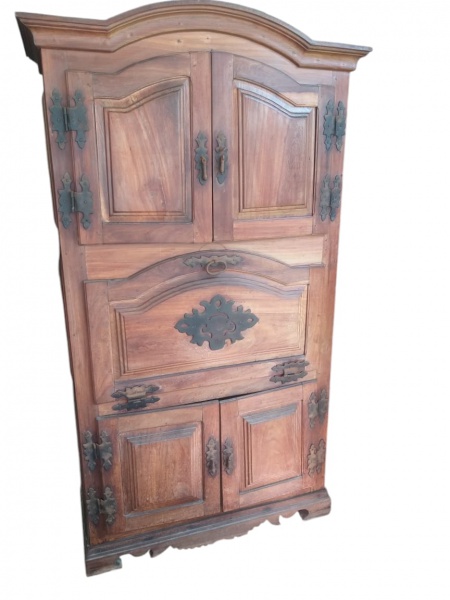 • Antigo louceiro em madeira nobre, com portas superiores e inferiores, apresentando interior com prateleiras e compartimentos, além de tampo frontal basculante, acabamento entalhado, ferragens trabalhadas e linhas clássicas com topo arqueado. Medidas: 190 x 107 x 42 cm.