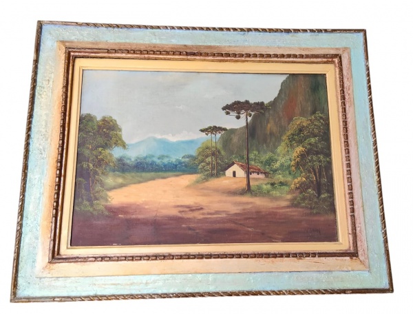 • V. Sopan. óleo sobre tela "Paisagem rural", assinado no canto inferior direito. Acompanha moldura em madeira com acabamento trabalhado. Medidas: 90 x 71 cm (moldura) e 64 x 45 cm (tela).