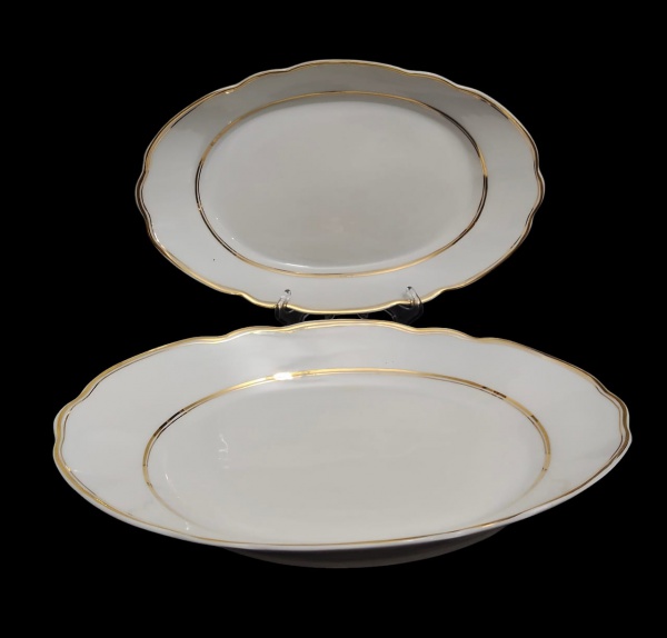 • Real. Duas travessas em porcelana nacional esmaltada na cor branca, com bordas onduladas e filetes em ouro. Medidas: 40 x 26 x 6 cm 36 x 23 x 5 cm. Em ótimo estado.
