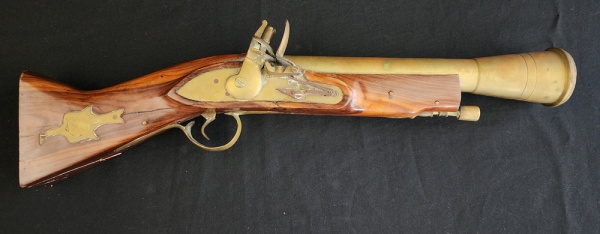 • Antiga Bacamarte decorativo em madeira e metal dourado, acondicionada em estojo de madeira. Medindo: 51 cm e caixa: 11 x 58 x 27 cm.