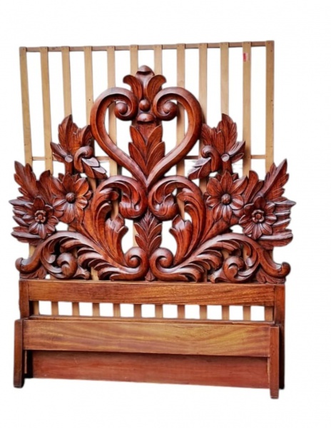 • Cama de casal em madeira maciça, com cabeceira ricamente entalhada em motivos florais e volutas, de estilo clássico. Estrutura robusta, apresentando sinais de uso compatíveis com o tempo. Medidas: 1,50 x 176 x 191 cm
