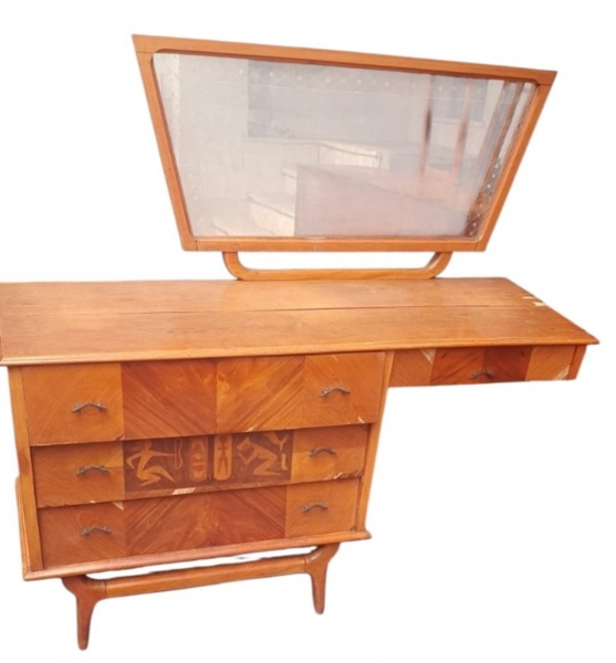 • Penteadeira anos 50 em madeira com acabamento em lâmina, composta por quatro gavetas e espelho original articulado. Peça de linhas elegantes. Medidas: 1,40 x 45 x 1,30 m (com espelho). Apresentando desgastes no folheado, necessitando restauração.