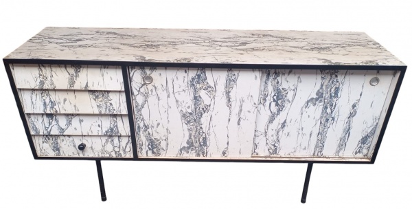 • Buffet anos 50/60 em fórmica branca marmorizada com detalhes em preto, composto por gavetas e portas de correr. Peça de linhas modernas, com pés metálicos, apresentando sinais de uso e necessitando lustrar na parte interna. Medidas: 1,63 x 46 x 80 cm.