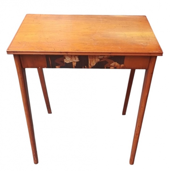 • Mesa lateral anos 50 em madeira, de linhas simples e funcionais. Apresenta desgaste no folheado central, necessitando restauração. Estrutura firme. Medidas: 69 x 47 x 76 cm.