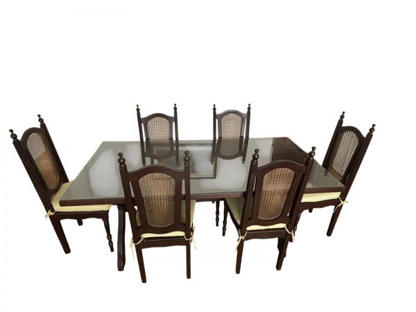 • Conjunto de jantar em madeira composto por mesa com tampo de vidro e seis cadeiras com encosto e assentos em palhinha sintética, acompanham estofados. Peças de estilo clássico, em bom estado geral de conservação. Medidas da mesa: 78 x1,80 x 90 cm. Retirada no Rio Comprido.