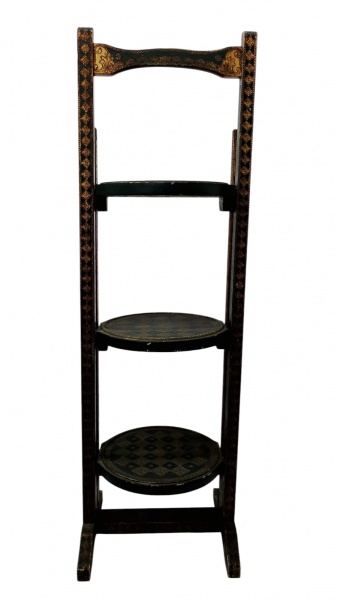 • Antiga Coluna/suporte em madeira com pintura decorativa, composta por três prateleiras circulares. Medidas: 87 x 27 x 23 cm.