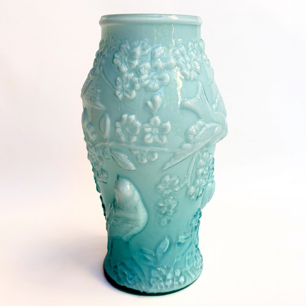 • Vaso em vidro opalinado dos anos 50 na tonalidade azul, decorado com pássaros e flores em relevo. Med 26 cm altura.