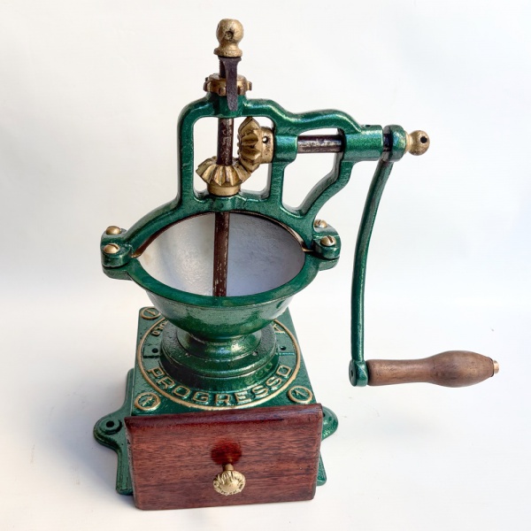 • Moedor de café da Fundição Progresso, todo em ferro com gaveta e punho em madeira, modelo 01.  Med 38 cm x 23 cm, funcionando, mas sem garantias.