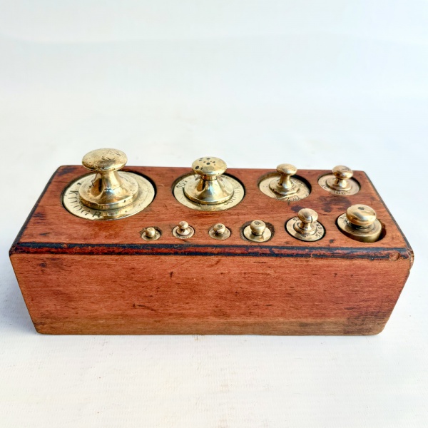 • Antigo conjunto de pesos para balança confeccionados em bronze, acondicionados em cepo de madeira composto por 10 pesos. Med 20 x 8,5 cm.
