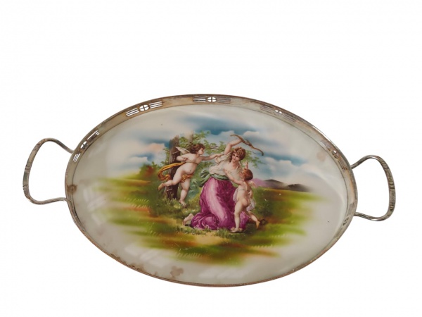 • Bandeja em faiança decorada com cena central em policromia representando mulher com cupidos em paisagem campestre, com rica composição de inspiração clássica. Possui galeria e alças em metal. Medidas: 4 x 39 x 22 cm.