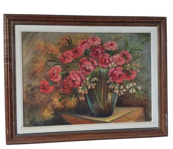 • Francisco de Paula. Quadro com pintura a óleo sobre tela, representando natureza-morta com arranjo floral em vaso, Assinado no canto inferior. Medindo: