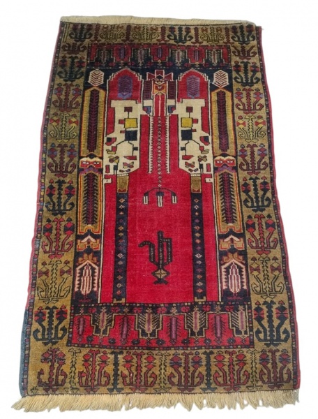 • Tapete oriental de oração, confeccionado manualmente, rica decoração geométrica em policromia, Medidas: 165 x 90 cm. Necessita de pequenos restauros.
