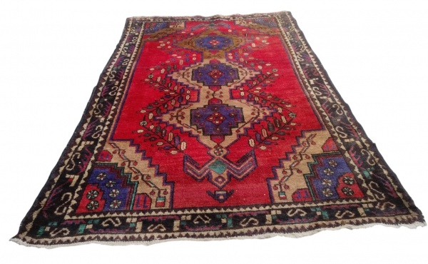 • Tapete oriental de estilo caucasiano, possivelmente Kazak, confeccionado manualmente, com campo em vermelho predominante e medalhões geométricos centrais, Apresenta sinais de uso e pequenos desgastes compatíveis com o tempo, sem comprometer sua estética decorativa. Medidas: 197 x 132 cm
