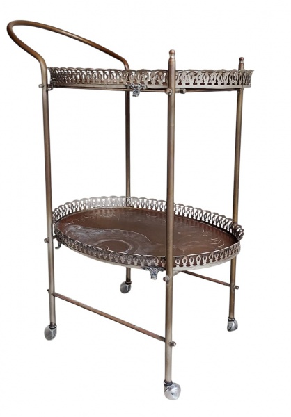 • Carrinho de chá/bar em metal espessurado a prata, com duas bandejas ovais e galerias vazadas decorativas, apoiado sobre rodízios. Peça de estilo clássico, funcional e decorativa. Apresenta desgaste do banho de prata, podendo ser restaurado. Medidas: 88 x 54 x 41 cm