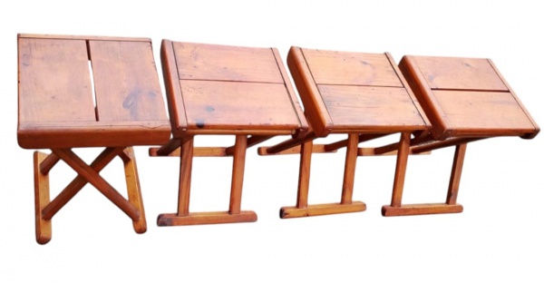 • Conjunto com 4 banquetas dobráveis em madeira, de linhas simples e funcionais, com assentos em ripas, apresentando sinais de uso compatíveis com o tempo. Medidas: 30 x 30 x 45 cm cada