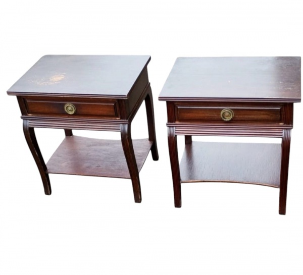 • Par de mesas de cabeceira em madeira maciça, com gaveta frontal e prateleira inferior, apoiadas sobre pés levemente curvos. Apresentando sinais de uso e necessitando leve lustro.Medidas: 52 X 48 x 35 cm cada