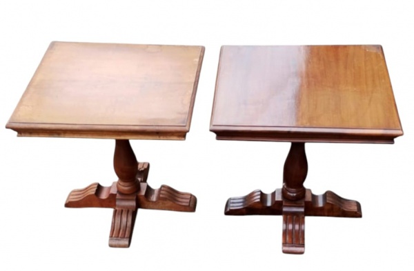 • Par de mesas de canto em madeira, com tampo quadrado, apoiadas sobre coluna central torneada e base em formato cruzado. Peças de estilo clássico, apresentando sinais de uso e desgaste no acabamento. Medidas: 50 x 50 x 46 cm cada