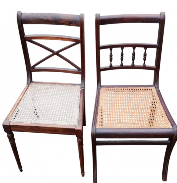 • Duas cadeiras em madeira, com assento em palhinha, sendo peças de modelos distintos. Uma apresenta palhinha natural e outra sintética. Estrutura com sinais de uso, sendo uma das cadeiras levemente frouxa. Medidas: 90 x 40 x 43 cm (aprox.).
