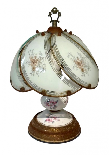 • Abajur decorativo vidro opalinado de estilo clássico, composto por cúpula em vidro com delicadas pinturas florais e estrutura em metal com base ornamentada; mede aproximadamente 33 cm de altura por 23 cm de largura. Apresenta oxidação no metal.