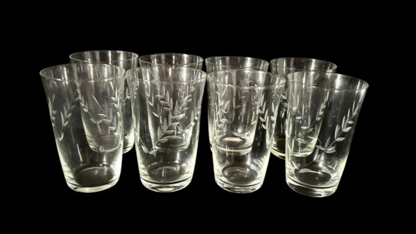 • Conjunto com 8 copos em vidro transparente, com delicado trabalho em relevo de folhas. Medindo: 11,5 x 7 cm.