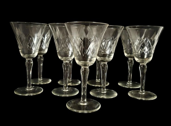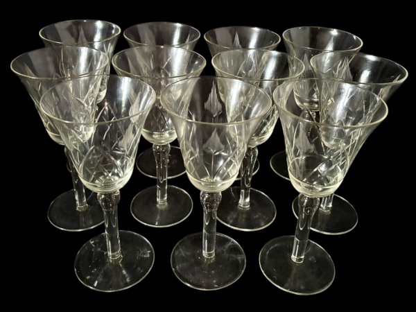 • Conjunto com 11 taças em vidro transparente, com delicado trabalho em relevo de folhas. Medindo: 18 x 8,5 cm.