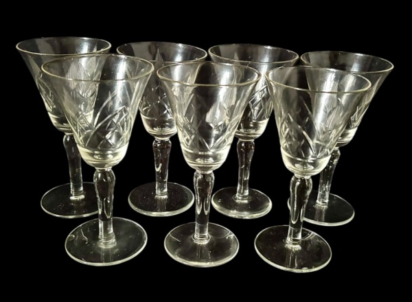 • Conjunto com 7 taças em vidro transparente, com delicado trabalho em relevo de folhas. Medindo: 13,5 x 7 cm.