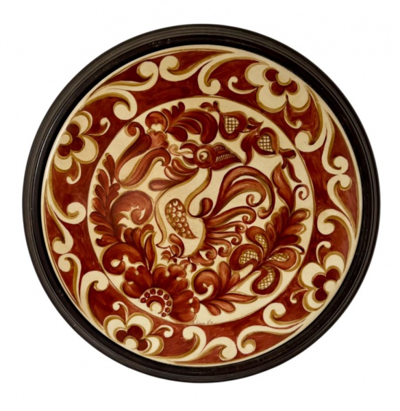 • Tábua redonda decorativa em madeira com aplicação central em porcelana ricamente ornamentada com motivos florais e arabescos em tons terrosos; mede aproximadamente 38 cm de diâmetro por 4 cm de altura, com estrutura robusta e bom acabamento, podendo apresentar sinais de uso e marcas do tempo.