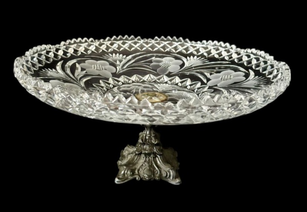 • Fruteira em cristal com pé em metal, apresentando belíssimo trabalho lapidado com detalhes florais e borda rica em relevo, com base  ornamentada; medindo: 18,5 x 36 cm