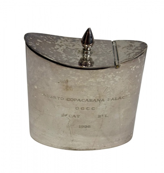 • Recipiente decorativo em metal espessurado à prata, tampa articulada, apresentando gravação frontal; medindo: 9 x 5 x 9,5 cm.