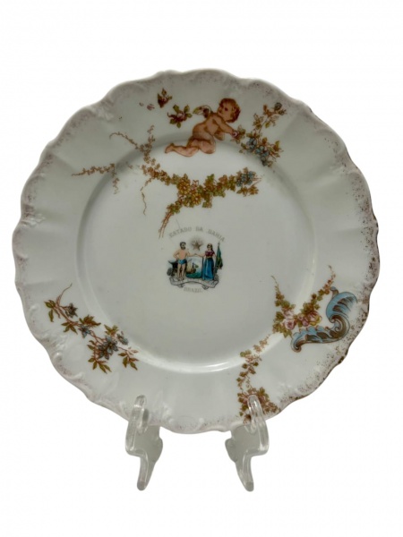 • Limoges, France - Prato decorativo em porcelana francesa, borda recortada e delicadamente trabalhada em relevo. Apresenta rica decoração policroma com motivos florais e figura de putti, além de brasão central com inscrição Estado da Bahia  Brazil. Medida: 18,5 cm de diâmetro.
