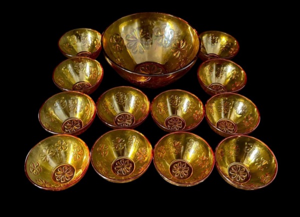 • Saladeira e doze bowls em vidro âmbar, ricamente trabalhados com detalhes florais em relevo. Medindo: 22,5 x 10,5 cm e 11 x 5 cm.