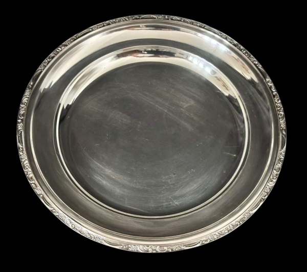 • Meridional - Travessa redonda em metal prateado com borda decorada em relevo, acabamento polido com marcas de uso e riscos superficiais. Medindo: 30 cm.