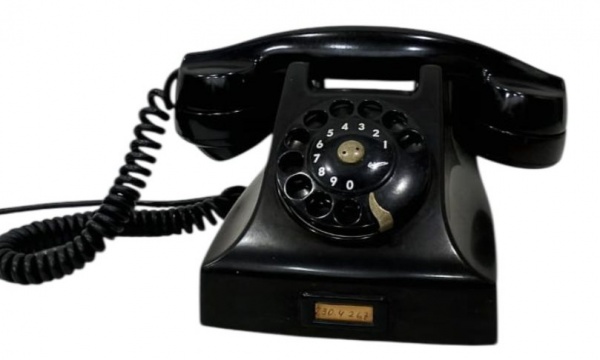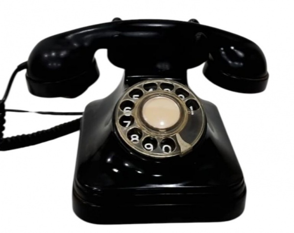 • Antigo telefone de mesa em baquelite preto, modelo de disco rotativo, com fone original e cabo espiral, apresentando sinais de uso. Medindo: 25 x 15 x 15 cm.