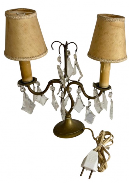 • Abajur de mesa em metal com acabamento dourado, com duas cúpulas em tecido bege e adornos pendentes em cristal. Medindo: 24 x 25 x 9 cm.