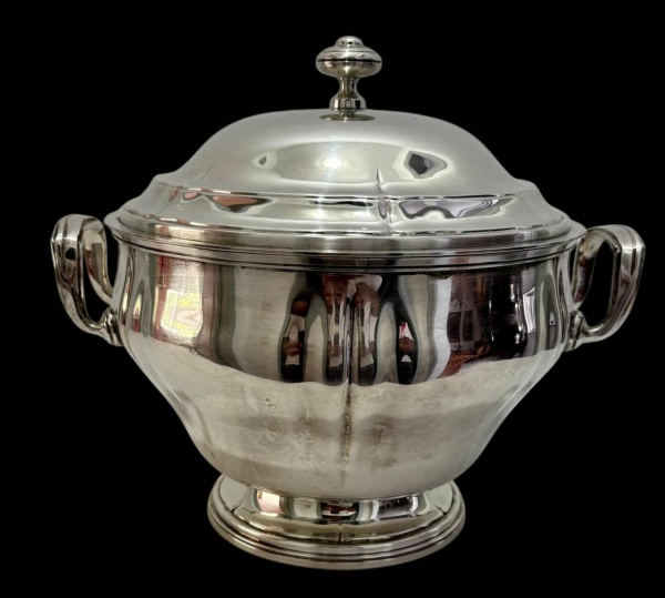 • Sopeira em metal prateado com tampa, alças laterais e base elevada, apresentando acabamento polido. Medindo:  30,5 x 24 x 25 cm.