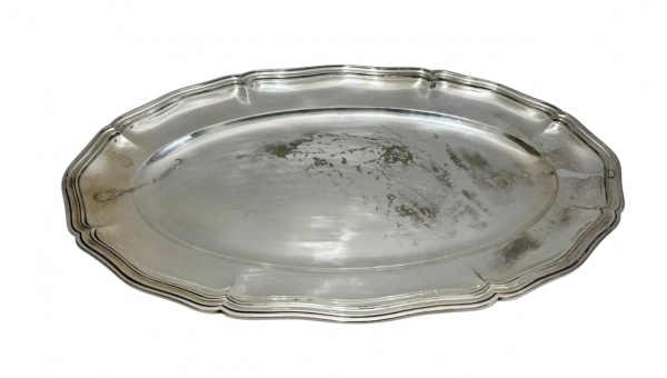 • CHRISTOFLE - Bandeja oval em metal prateado com bordas recortadas e aba elevada, apresentando marcas de uso, riscos e desgaste do tempo. Medindo: 50 x 31 cm.