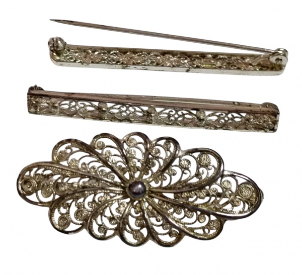 • Conjunto de três peças em prata, composto por duas presilhas e um broche com trabalho rendilhado e detalhe central. Peso total: 7,9 gramas. Medidas: 4 cm e 4,5 cm.