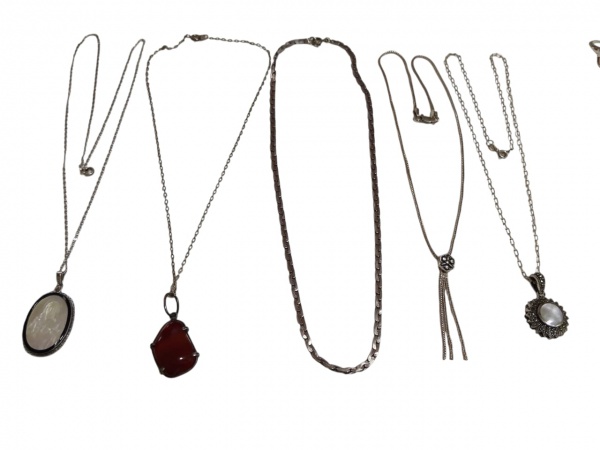 • Conjunto com cinco colares em prata, teores 900 e 925, compostos por diferentes estilos de correntes e pingentes. Inclui peças com pedras e detalhes ornamentais, como pingente oval, pedra vermelha e acabamento trabalhado. Possuem tamanhos aproximados de 39 cm, 44 cm e 45 cm, com peso total de 31 gramas.