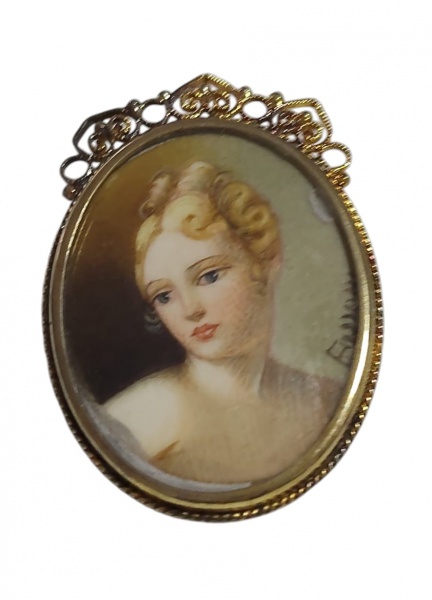 • Antigo broche em prata teor 800, com delicado trabalho ornamental e acabamento dourado. A peça apresenta uma miniatura feminina em estilo clássico, protegida por lente frontal. Medindo: 3,5 x 2,5 cm.
