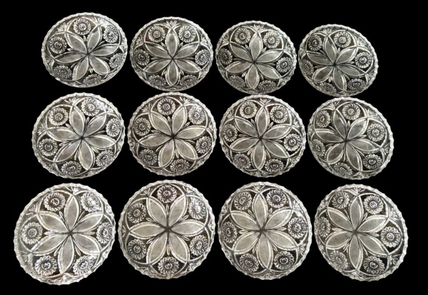• Doze bowls em cristal translúcido com rica lapidação geométrica e floral, apresentando desenho central em formato de flor estilizada, circundada por elementos facetados. Bordas levemente onduladas, com acabamento trabalhado. Medindo: 14,5 x 3 cm.
