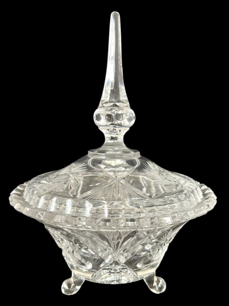 • Bomboniere em cristal translúcido com rica lapidação geométrica e motivos radiais em formato de estrela. Corpo com laterais facetadas e base apoiada sobre três pés delicadamente moldados. Medindo: 27,5 x 20,5 cm.