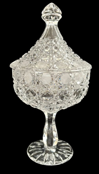 • Bomboniere em cristal translúcido lapidado com pé e tampa, corpo em formato de taça com rica lapidação geométrica em losangos, estrelas e elementos facetados, base elevada sobre haste e pé circular, bordas com acabamento serrilhado. Medindo: 30 x 15,5 cm.