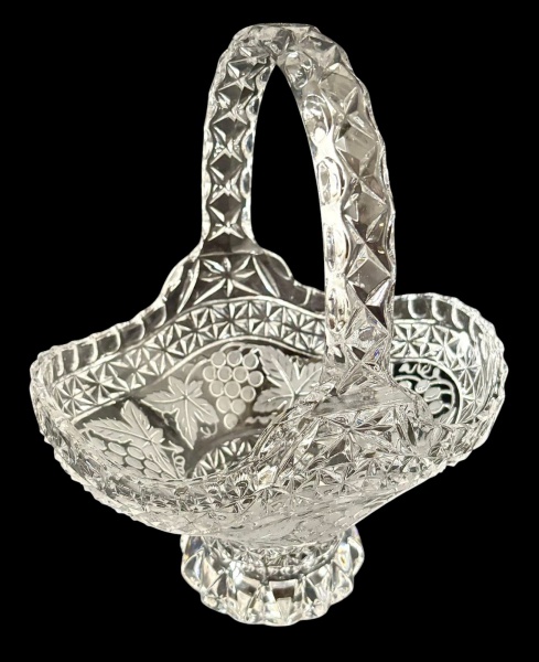 • Cesta em cristal translúcido lapidado, corpo ricamente trabalhado com padrões geométricos e florais, borda ondulada com acabamento serrilhado, base elevada e facetada, alça robusta igualmente lapidada integrada à estrutura. Medindo: 20,5 x 15,5 x 24,5 cm.