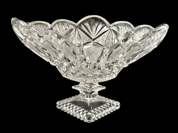 • Centro de mesa em cristal translúcido lapidado, com rica decoração geométrica em alto relevo, borda recortada ondulada, corpo amplo e profundo, apoiado sobre base elevada quadrada e facetada. Medindo: 31 x 20 x 19,5 cm.