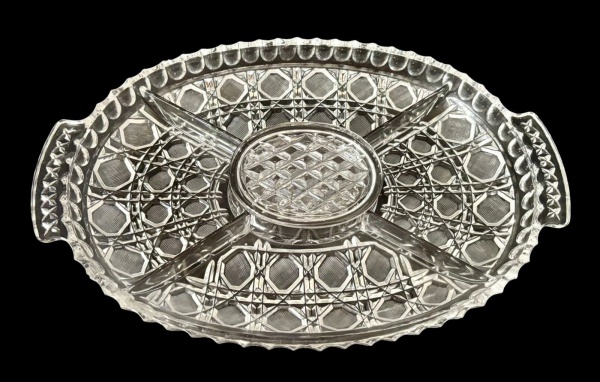 • Petisqueira em cristal translúcido lapidado, formato circular com divisórias internas e compartimento central com tampa removível, rica decoração geométrica em relevo, borda recortada com leve ondulação. Medindo: 34,5 x 21,5 cm.