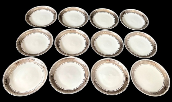 • Steatita - Doze bowls em porcelana com aba decorada em tom prateado e detalhes em relevo formando cenas clássicas ao redor da borda. Filete fino próximo à área central. Medindo: 15 x 2 cm.